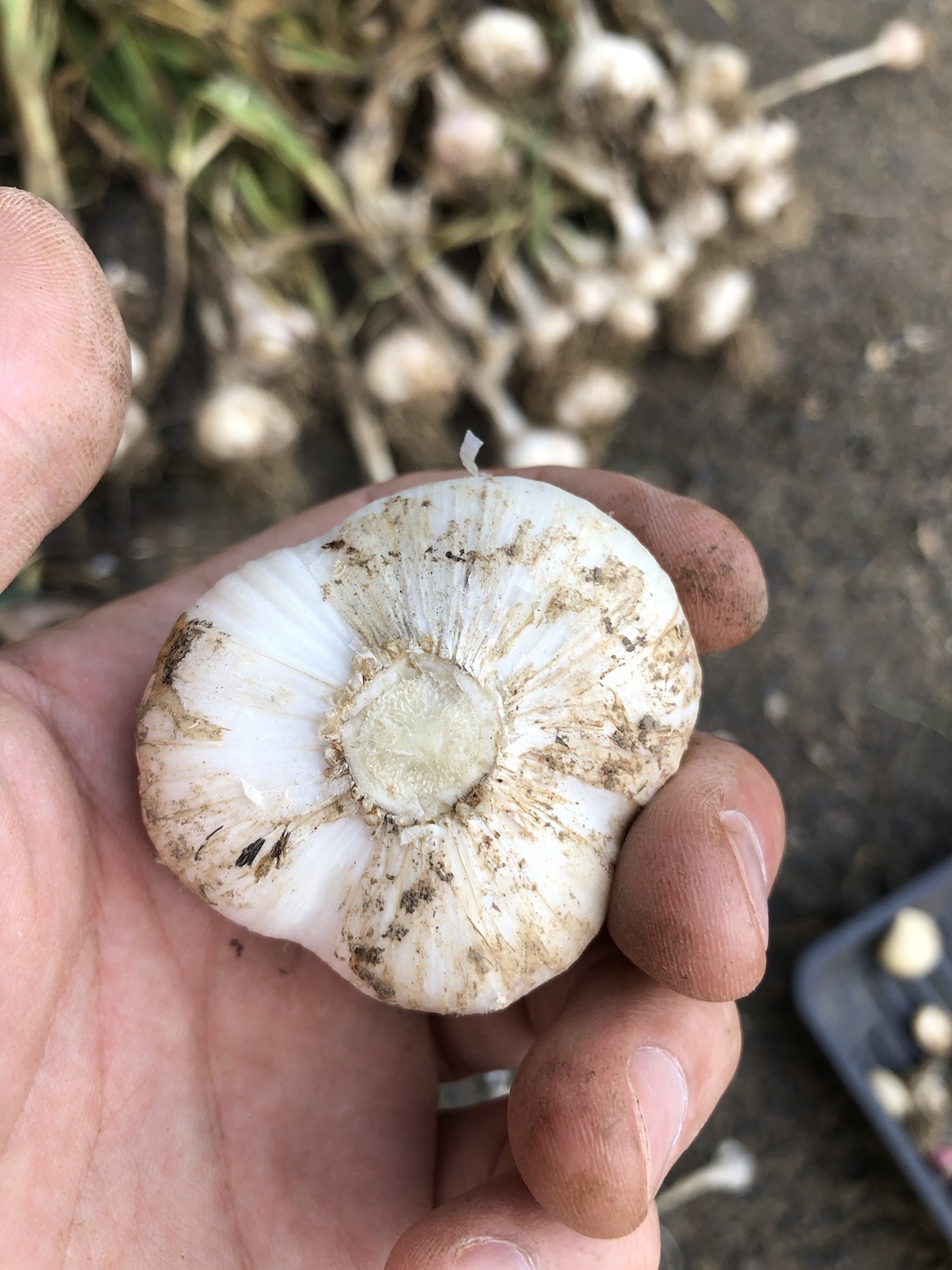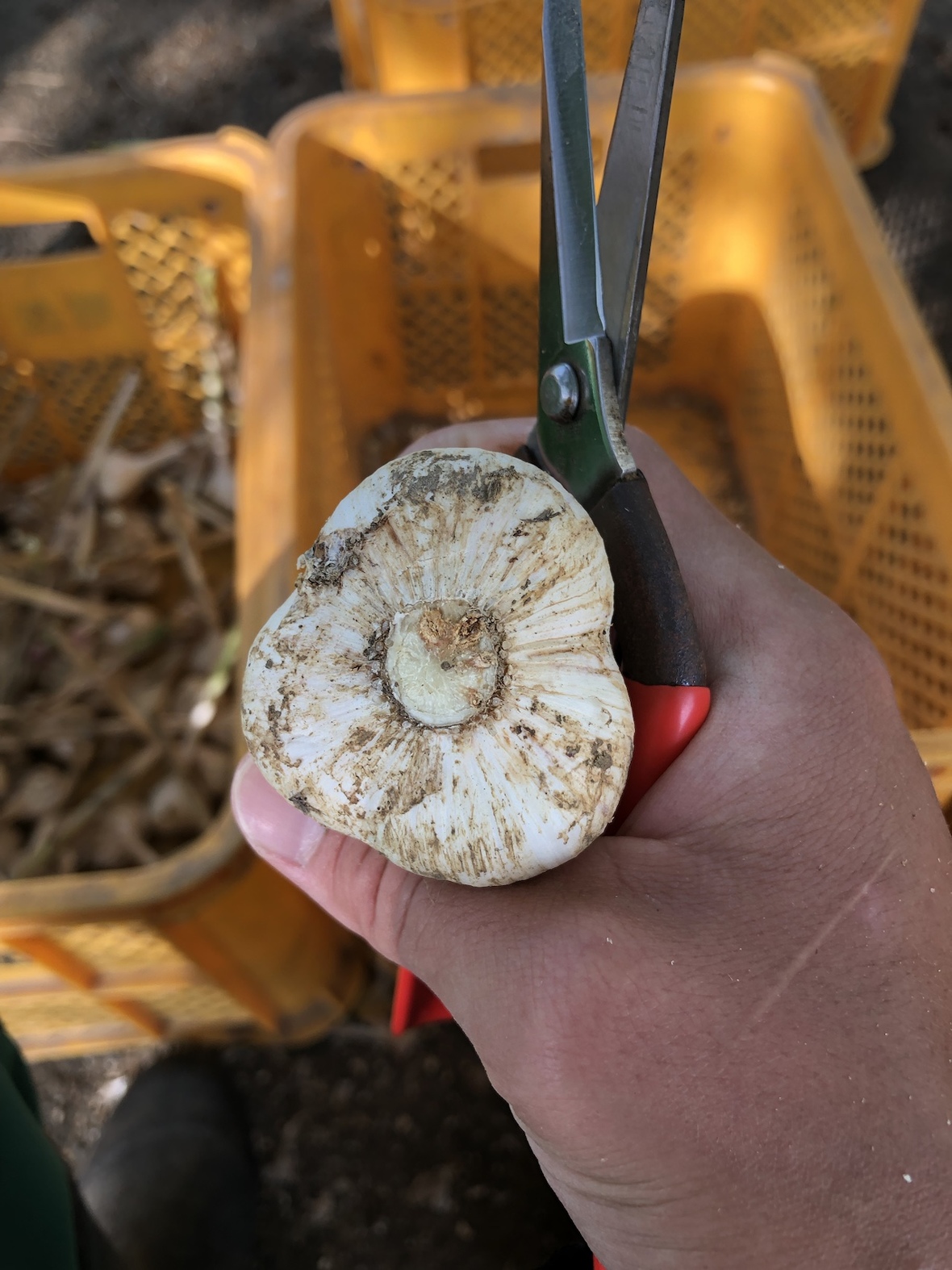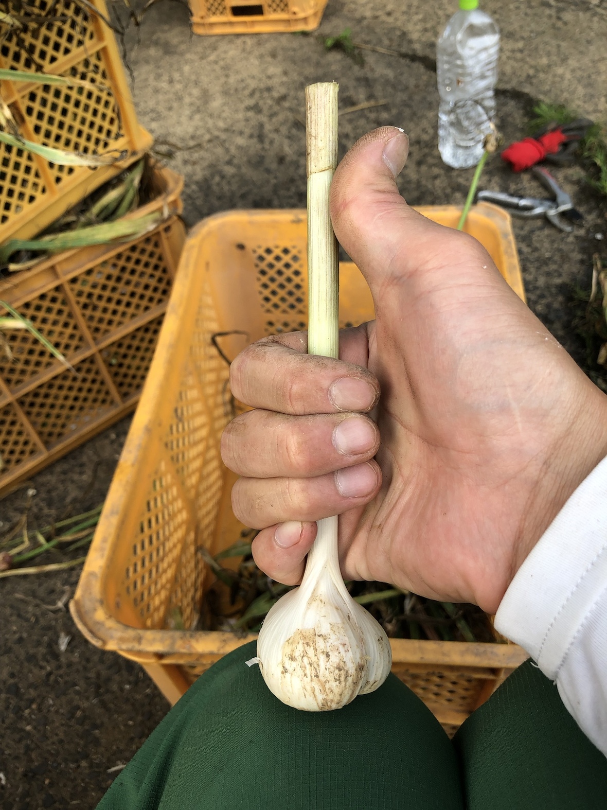 そのため、種球(たねきゅう)と呼ばれる種は、購入したものになりますが、今年の作付けは、今回収穫したニンニクを使い、次世代へと種をつないでいきます。