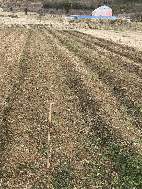 - 不耕起の場合は土が湿っていて、ゴロゴロしていないので、つるはしの刃を棒に括りつけた道具でも効率化が図れるかもしれない